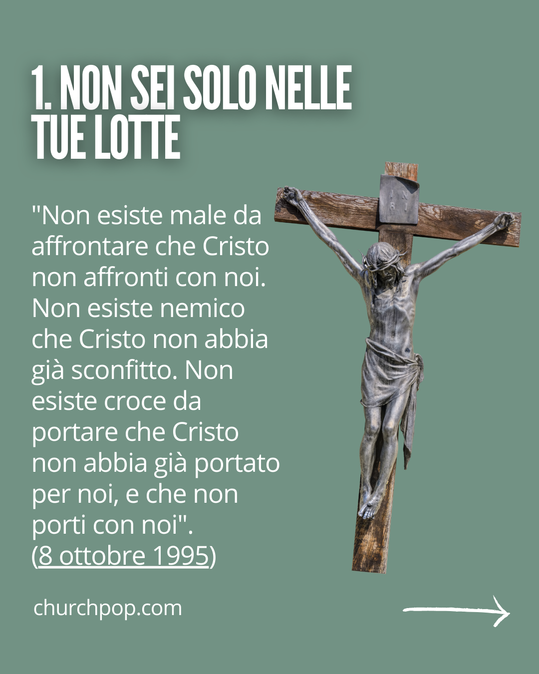"Non esiste male da affrontare che Cristo non affronti con noi. Non esiste nemico che Cristo non abbia già sconfitto. Non esiste croce da portare che Cristo non abbia già portato per noi, e che non porti con noi". (8 ottobre 1995)