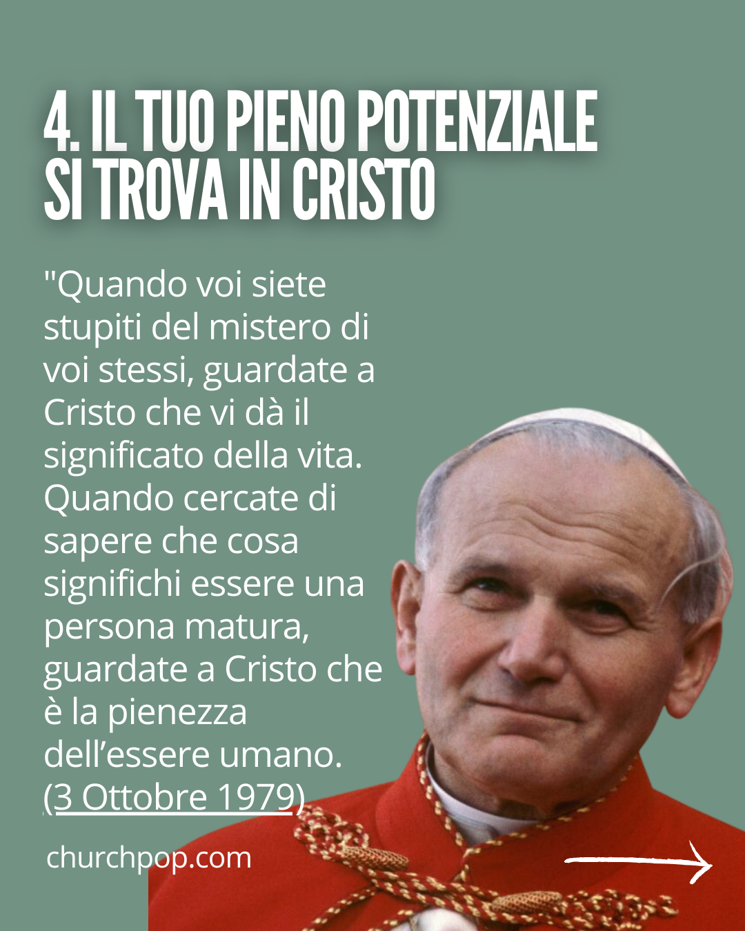 "Quando voi siete stupiti del mistero di voi stessi, guardate a Cristo che vi dà il significato della vita. Quando cercate di sapere che cosa significhi essere una persona matura, guardate a Cristo che è la pienezza dell’essere umano. E quando cercate di immaginare quale sarà il vostro ruolo nel futuro del mondo e degli Stati Uniti, guardate a Cristo. È solo in Cristo che raggiungerete le vostre possibilità come cittadini degli Stati Uniti e della comunità mondiale". (3 ottobre 1979)