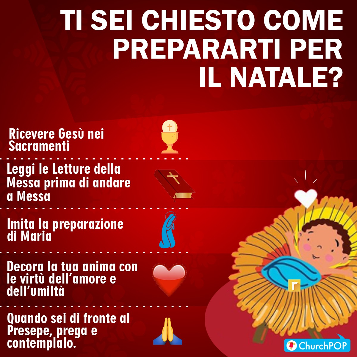FeaturedInfográficoListe 5 Passi per Preparare la tua Anima al Natale Editor di ChurchPOP 24 dicembre 2017 — 1 minuto di lettura Condividi questo articolo Il link è stato copiato! Condividi questo articolo Il link è stato copiato!