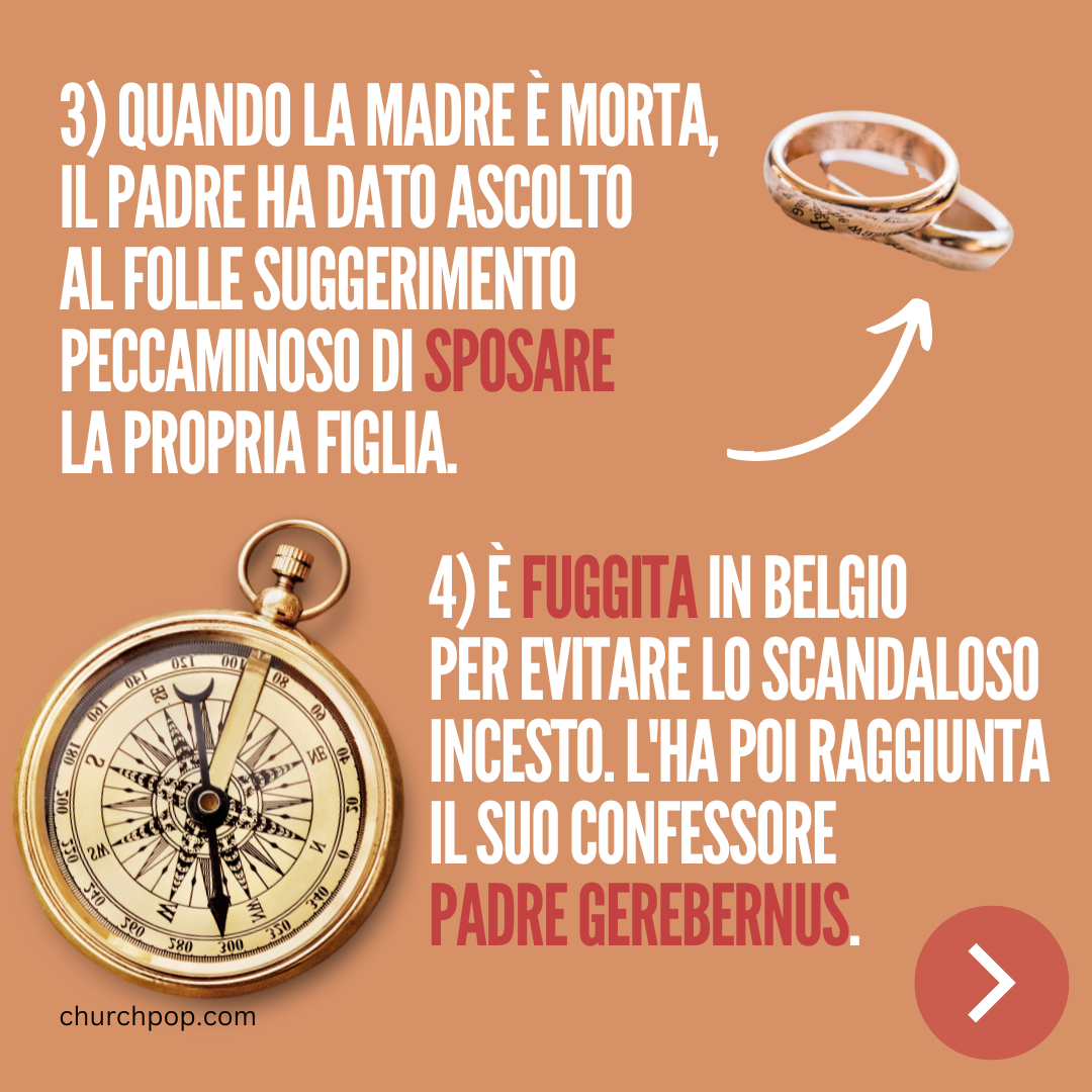4) È fuggita in Belgio per evitare lo scandaloso incesto. L'ha poi raggiunta il suo Confessore Padre Gerebernus.