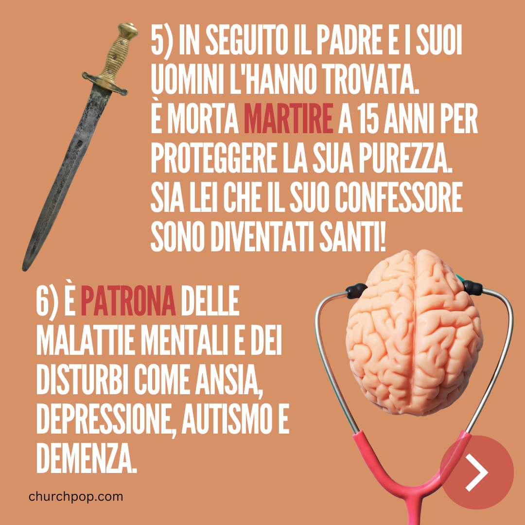 5) In seguito il padre e i suoi uomini l'hanno trovata. È morta martire a 15 anni per proteggere la sua purezza. Sia lei che il suo Confessore sono diventati Santi!
