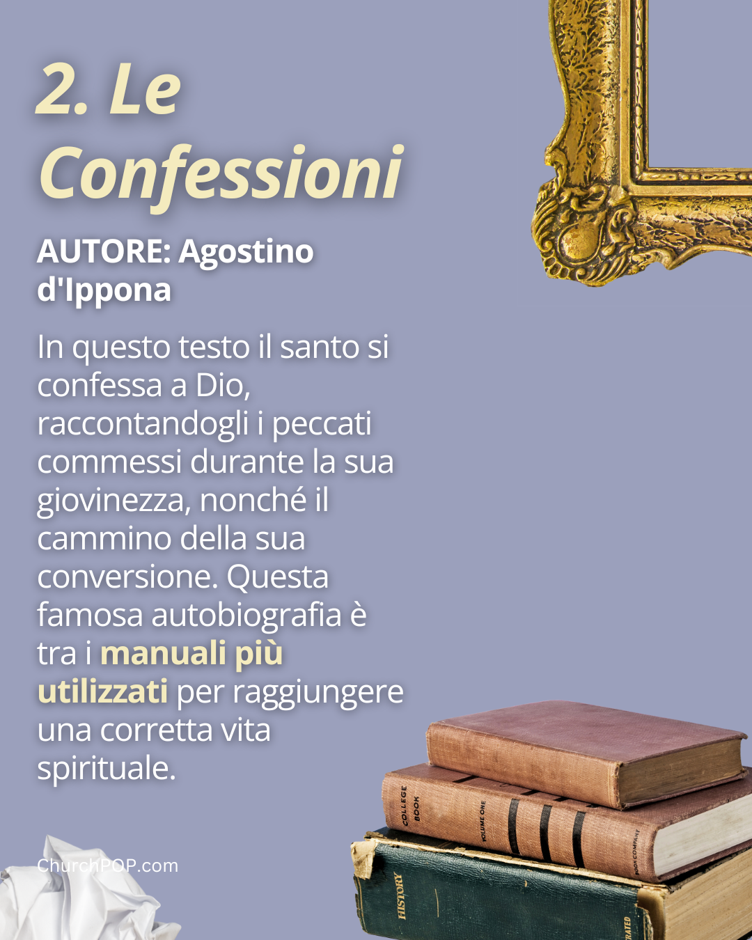 In questo testo il santo si confessa a Dio, raccontandogli i peccati commessi durante la sua giovinezza, nonché il cammino della sua conversione. Questa famosa autobiografia è tra i manuali più utilizzati per raggiungere una corretta vita spirituale.