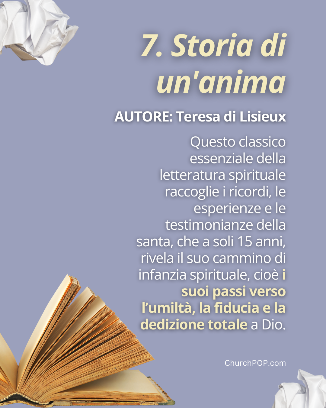 Questo classico essenziale della letteratura spirituale raccoglie i ricordi, le esperienze e le testimonianze della santa, che a soli 15 anni, rivela il suo cammino di infanzia spirituale, cioè i suoi passi verso l’umiltà, la fiducia e la dedizione totale a Dio.