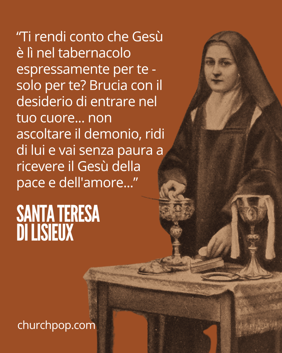 “Ti rendi conto che Gesù è lì nel tabernacolo espressamente per te - solo per te? Brucia con il desiderio di entrare nel tuo cuore... non ascoltare il demonio, ridi di lui e vai senza paura a ricevere il Gesù della pace e dell'amore...” - Santa Teresa di Lisieux