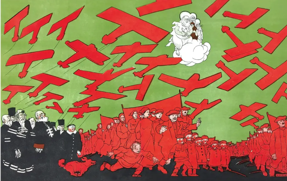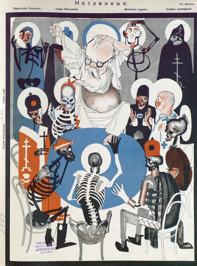 Godless at the Machine era una delle due riviste propagandistiche antireligiose distribuite dallo stato sovietico, che includeva immagini satiriche e articoli che miravano a offendere i fedeli. Questa immagine, chiamata Red Flood, raffigura la sacra famiglia assalita dalla potenza dello Stato.