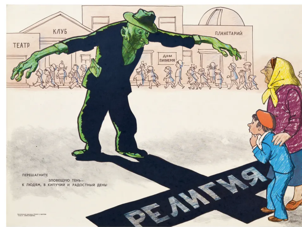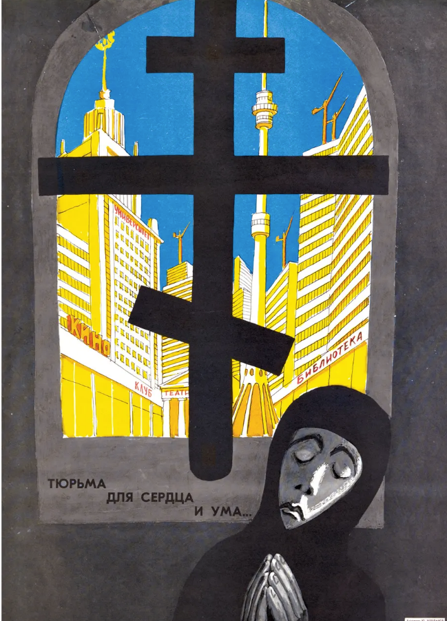 Le parole su questo poster di propaganda antireligiosa, che sarebbero state affisse sui muri di tutta l’URSS, recitano: “Una prigione di cuore e mente”.