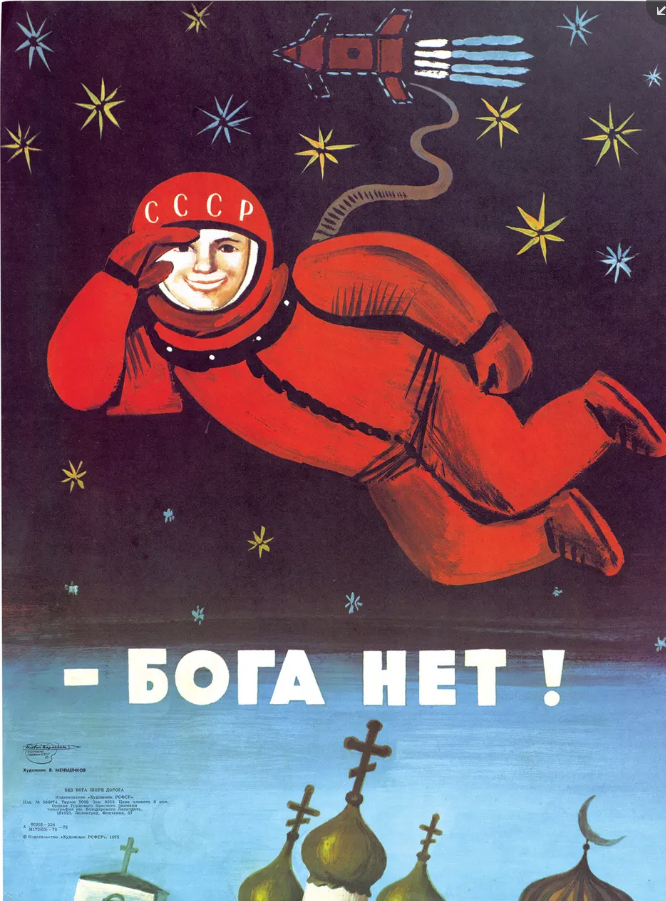 Il più importante astronauta ateo fu Gherman Titov, il cui volo nell’agosto del 1961 seguì quello di Yuri Gagarin in quell’aprile. Nel 1962, disse dalla platea di Seattle, che non aveva visto divinità o angeli nello spazio e che credeva nella forza e nella ragione dell’umanità. Questo poster intitolato Non c’è dio! – lo commemora.