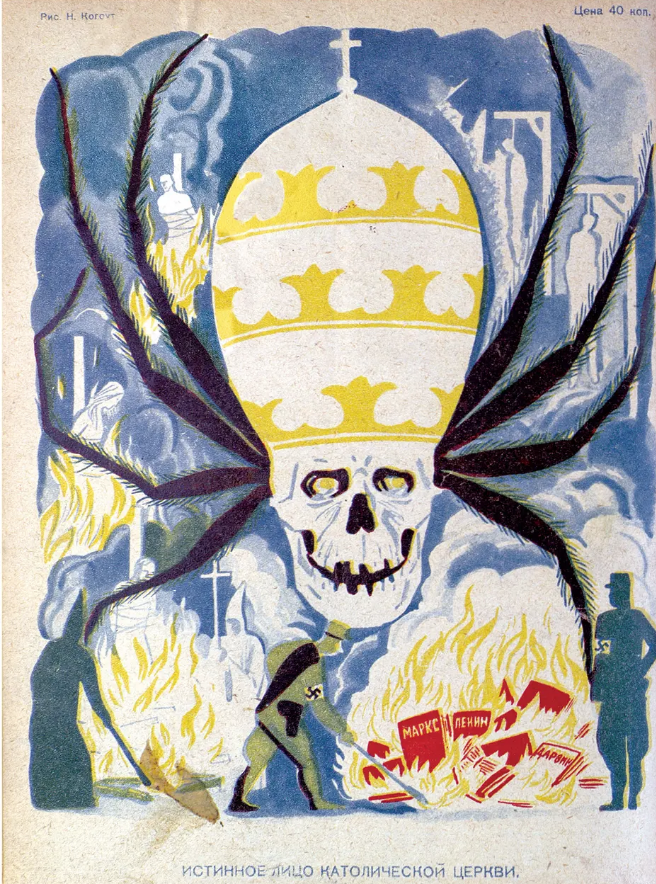 Intitolato il “Vero volto della Chiesa Cattolica, raffigura un papa scheletrico con zampe di ragno che gli fuoriescono dalla testa che guarda dei libri di Marx, Lenin e Darwin bruciare.