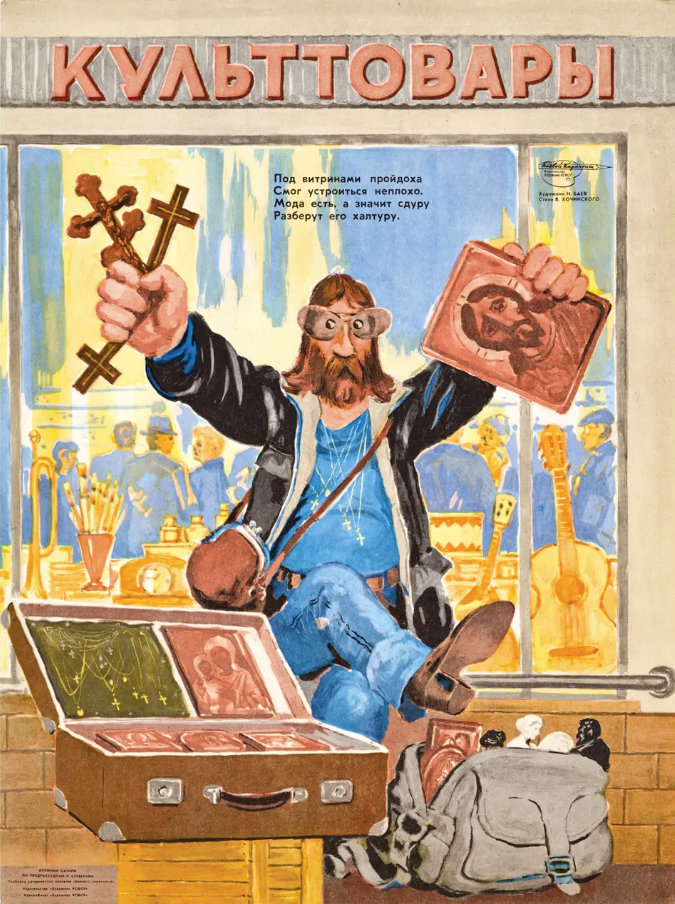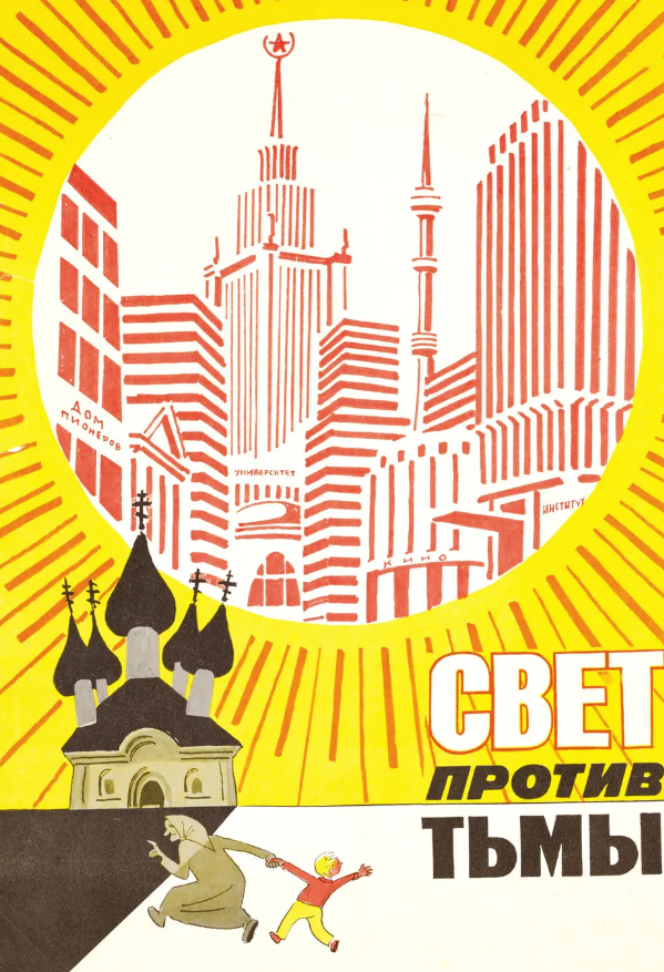 La copertina di una collezione di manifesti del 1981 chiamata Light Against Darkness mostra un ragazzo che cerca di dileguarsi dalla presa di un babushka che lo vuole forzare ad entrare in una chiesa in penombra. Notare il contrasto con la grande e moderna metropoli.