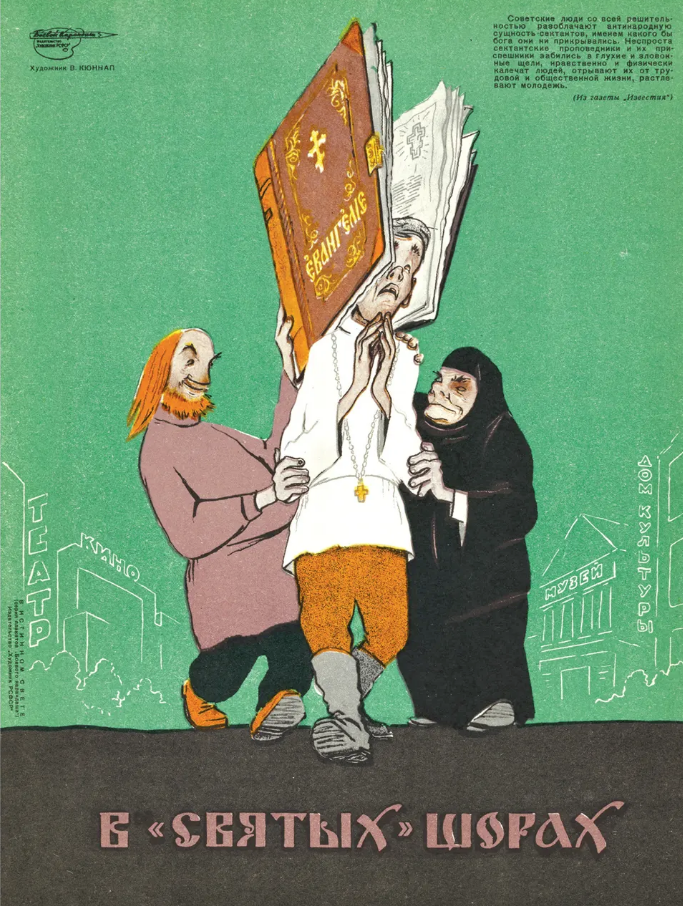 Intitolato “Holy” Blinkers, questo poster raffigura due figure astute che guidano un terzo innocente, usando la loro Bibbia per impedirgli di guardare a destra o a sinistra. Come diceva Izvestia: “Il popolo sovietico sta, con tutta determinazione, esponendo la natura antipopolare dei settari, non importa dietro quale dio si nascondano. Per ragioni dei loro stessi predicatori settari e dei loro accoliti, si rannicchiano in buchi fetidi, deformano moralmente e fisicamente le persone, strappano via la vita lavorativa e sociale e corrompono la gioventù.