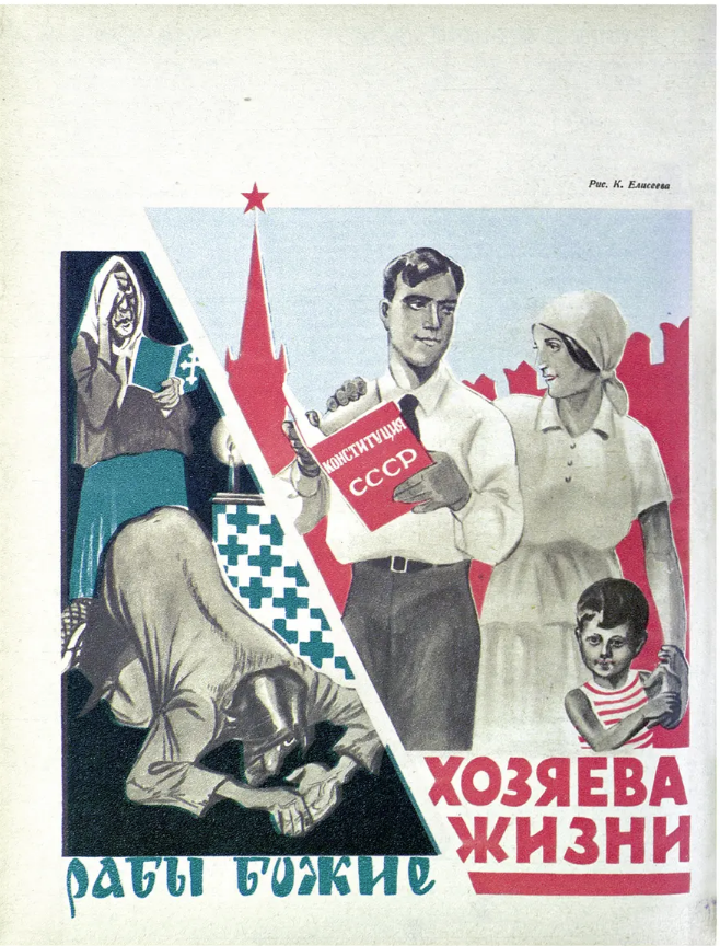 Questa immagine contrappone “Gli schiavi di Dio” in ginocchio e al buio con il sovietico “Maestri della vita”.