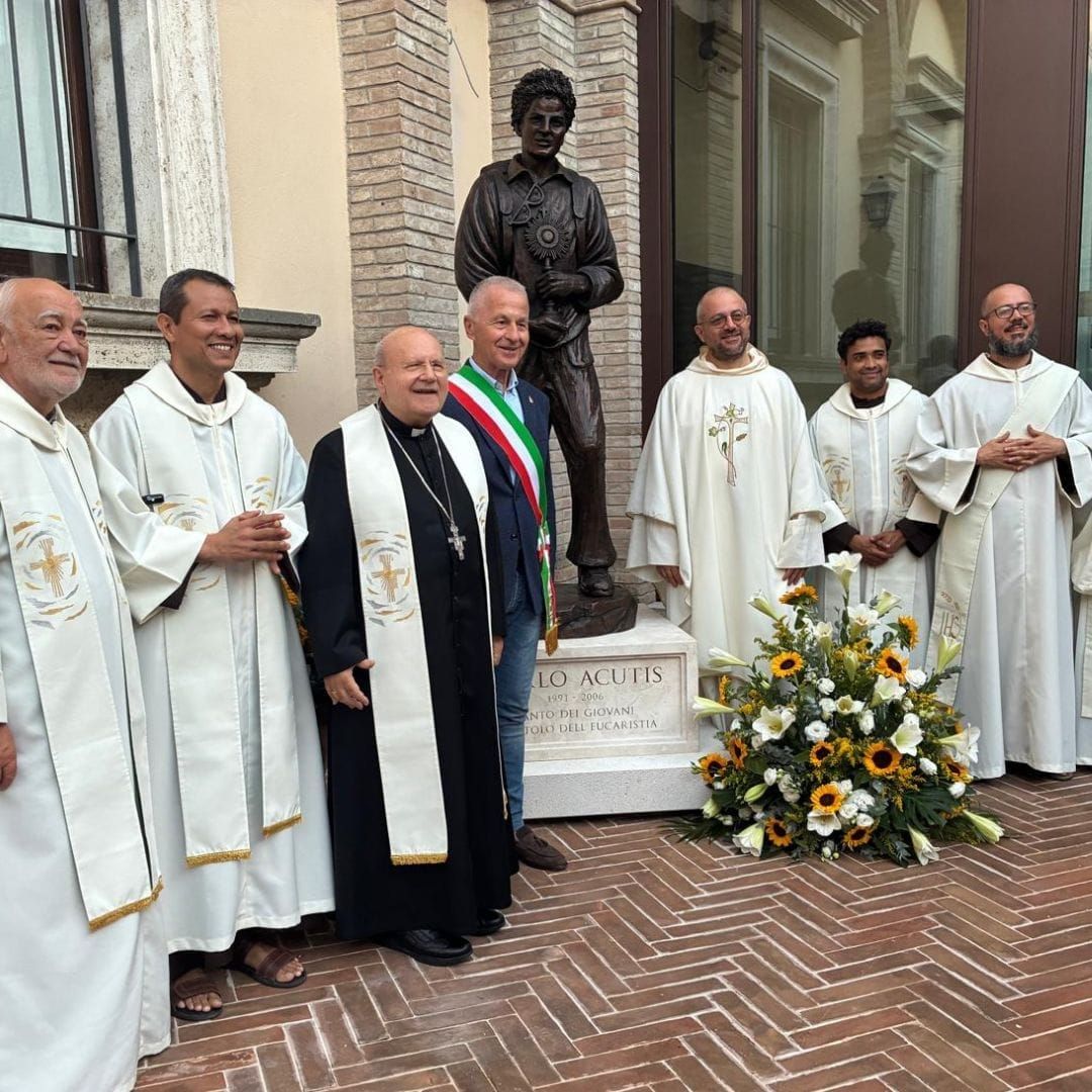 San Carlo, raffigurato con lo zaino e le scarpe da ginnastica, sta custodendo il Santissimo Sacramento