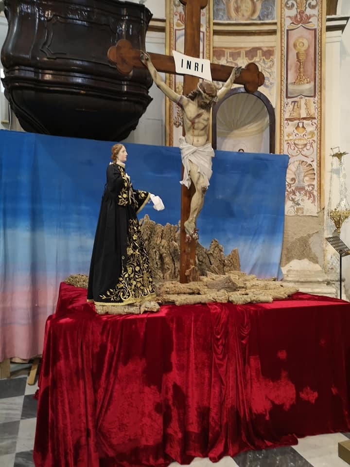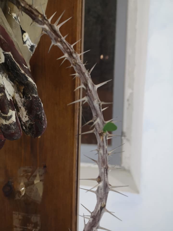 Nella Chiesa parrocchiale dei Santi Silverio e Domitilla, foglioline e fiori freschi sono cresciuti sui rami secchi che compongono la corona di spine appoggiata ai piedi del crocifisso.