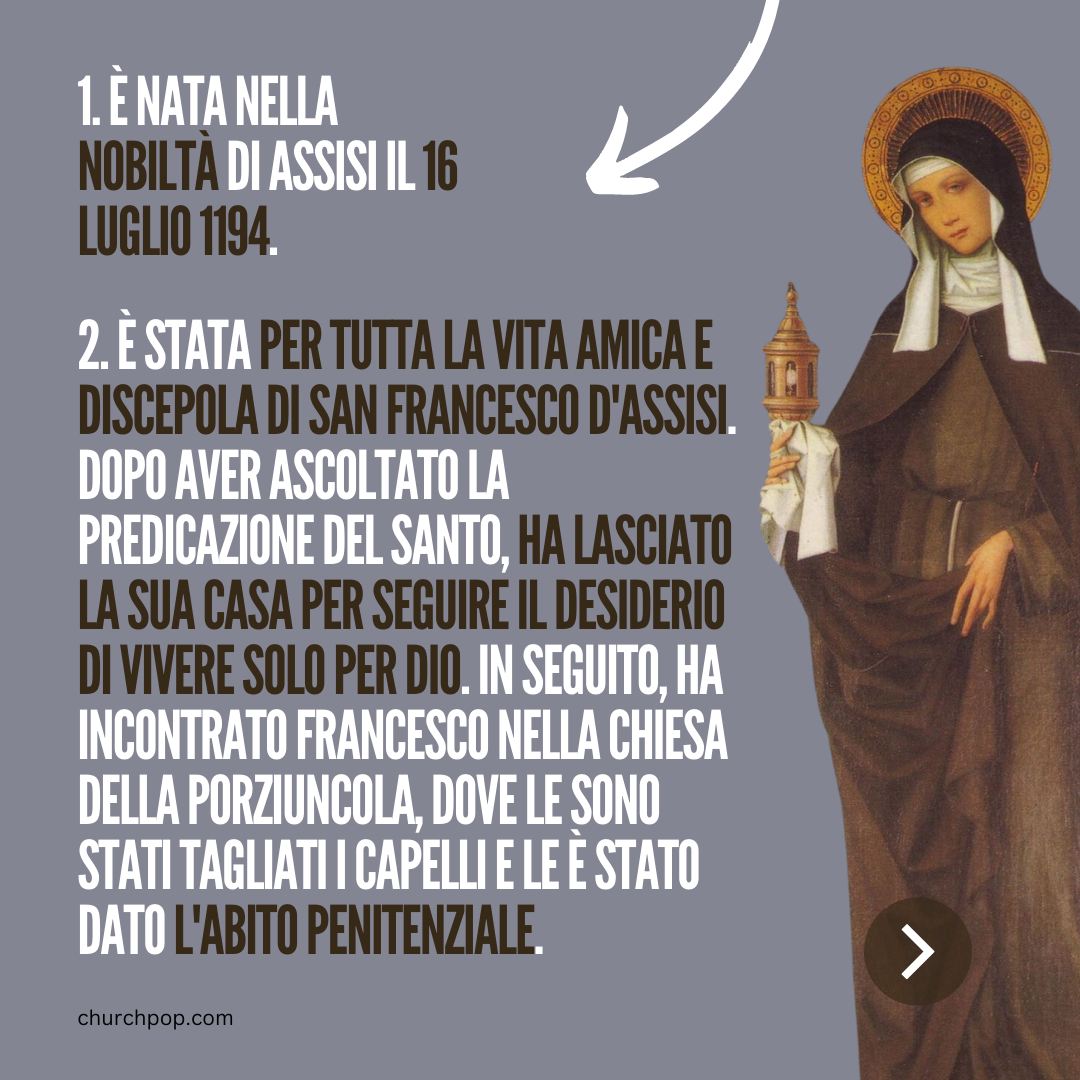 2. È stata per tutta la vita amica e discepola di San Francesco d'Assisi. Dopo aver ascoltato la predicazione del Santo, ha lasciato la sua casa per seguire il desiderio di vivere solo per Dio. In seguito, ha incontrato Francesco nella Chiesa della Porziuncola, dove le sono stati tagliati i capelli e le è stato dato l'abito penitenziale.