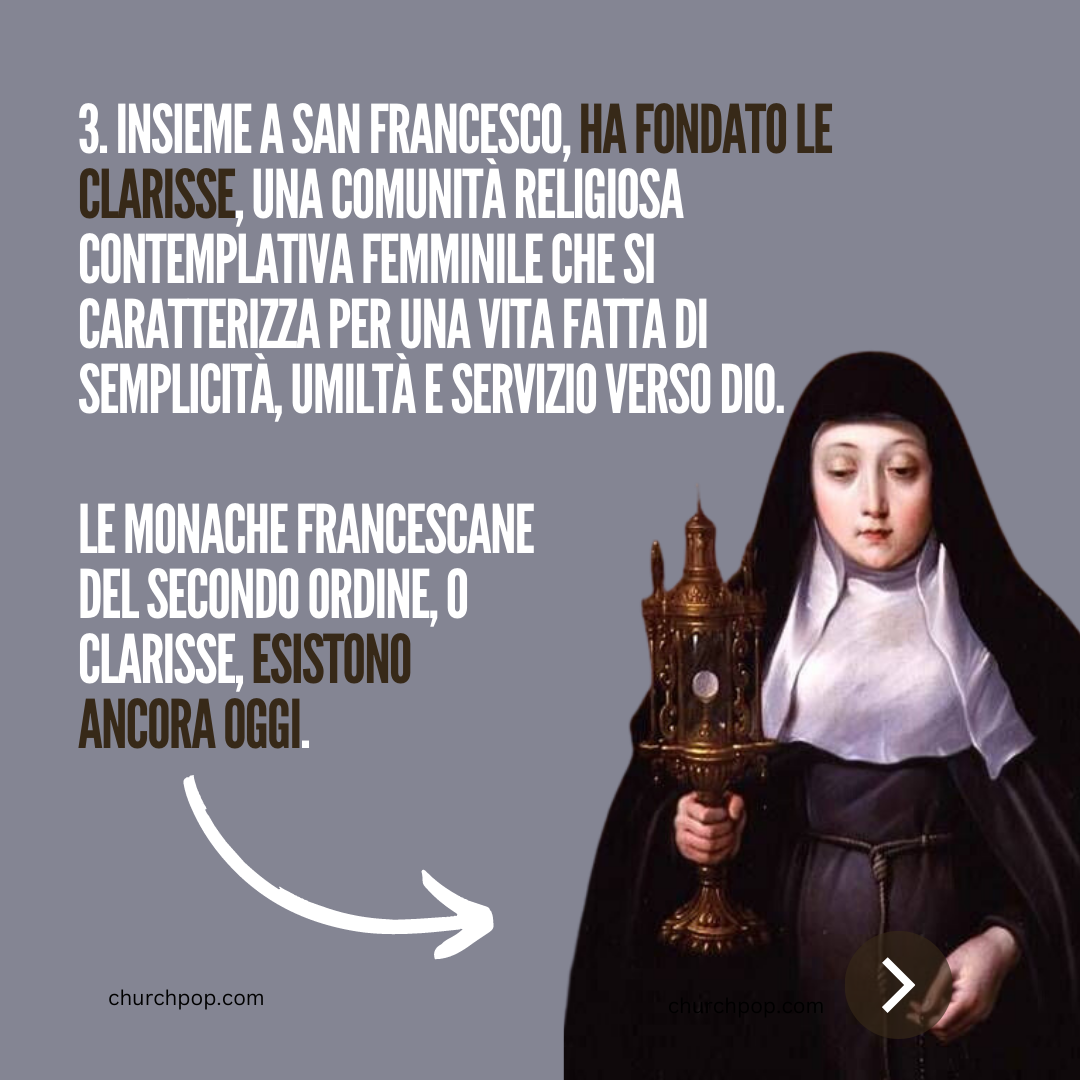 3. Insieme a San Francesco, ha fondato le Clarisse, una comunità religiosa contemplativa femminile che si caratterizza per una vita fatta di semplicità, umiltà e servizio verso Dio. Le Monache Francescane del Secondo Ordine, o Clarisse, esistono ancora oggi.