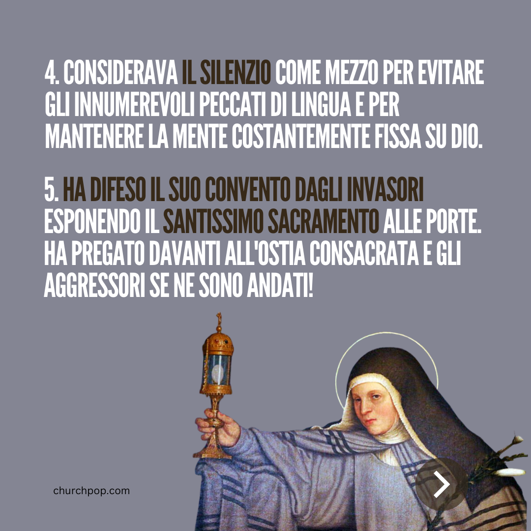 5. Ha difeso il suo Convento dagli invasori esponendo il Santissimo Sacramento alle porte. Ha pregato davanti all'Ostia Consacrata e gli aggressori se ne sono andati!