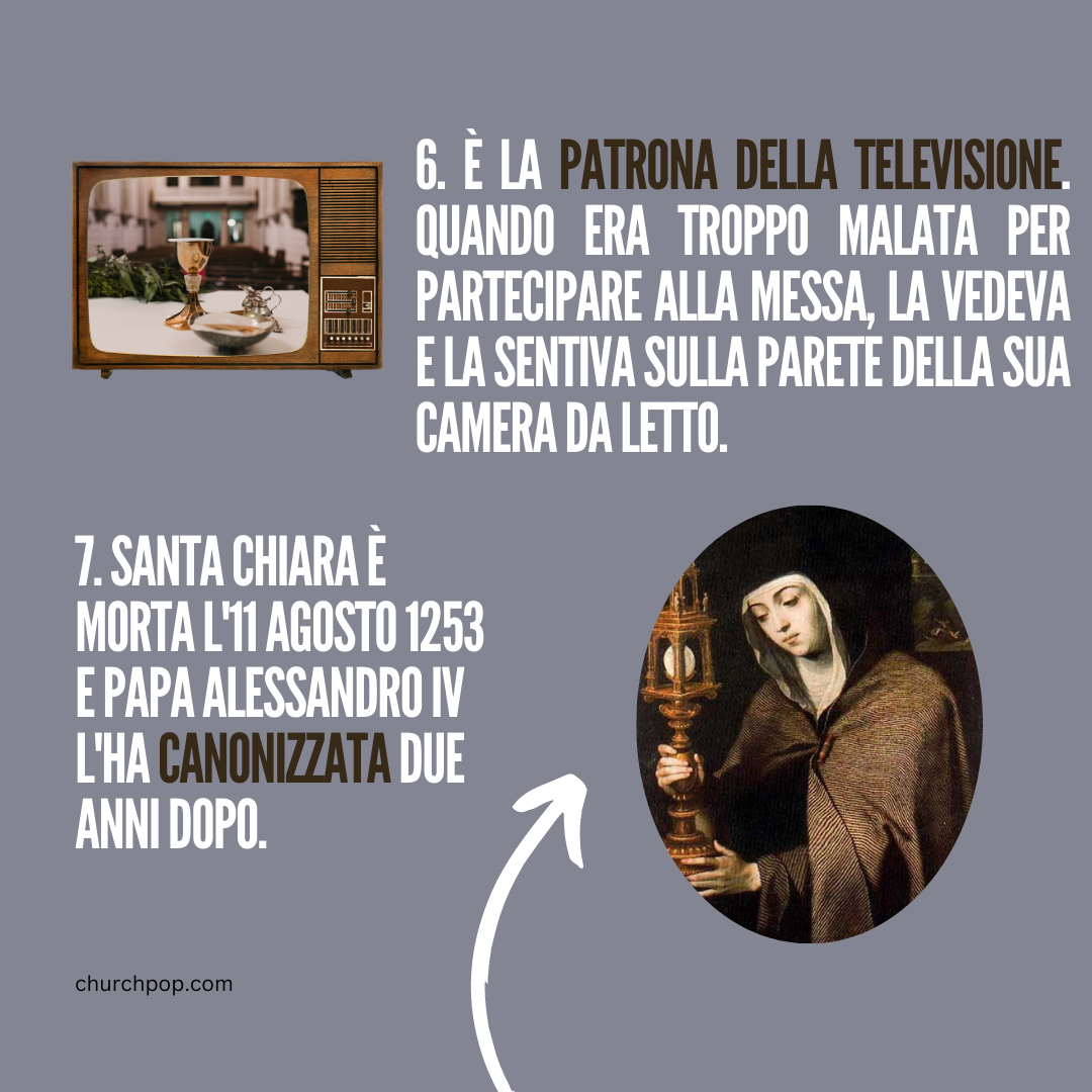 6. È la Patrona della televisione. Quando era troppo malata per partecipare alla Messa, la vedeva e la sentiva sulla parete della sua camera da letto.