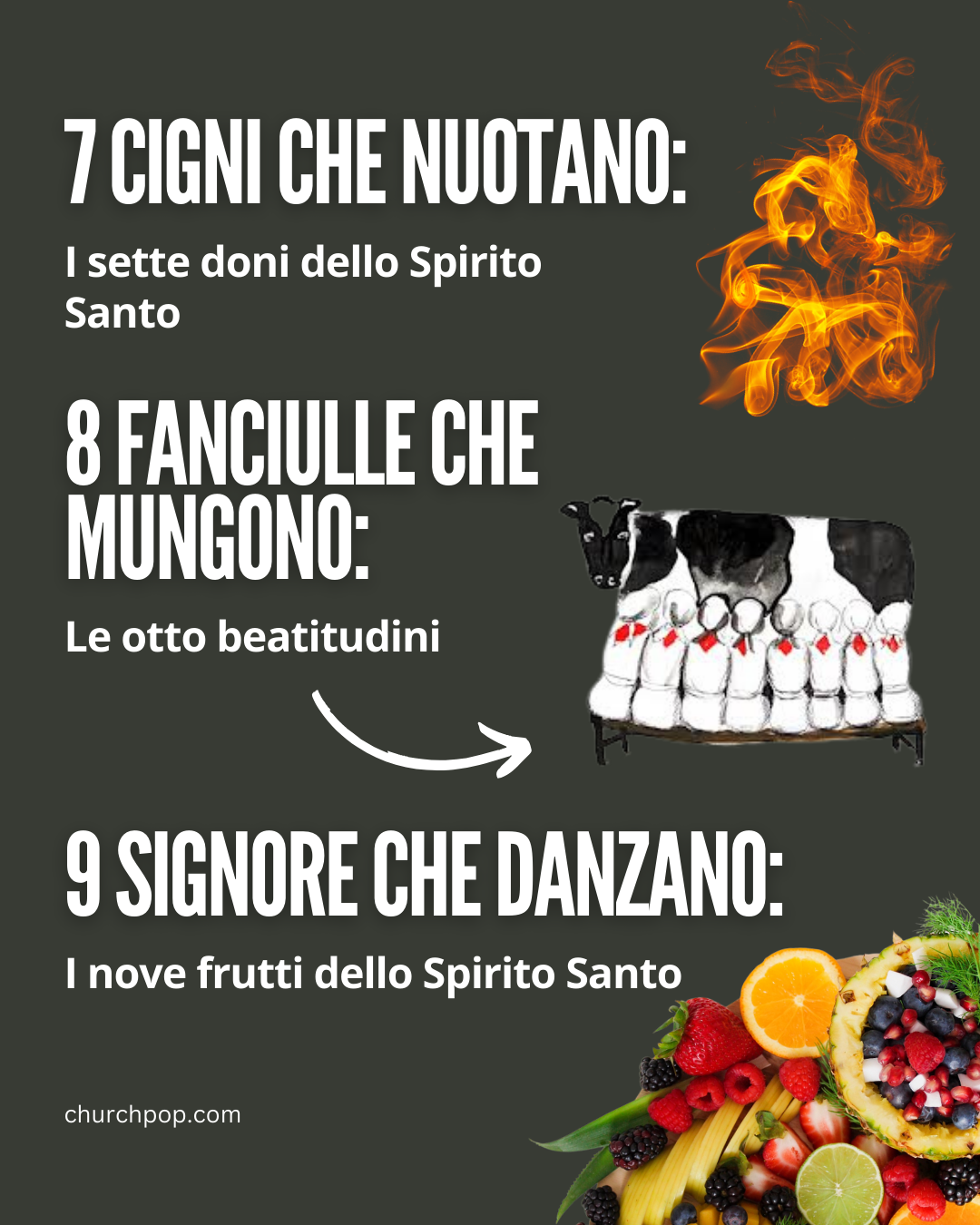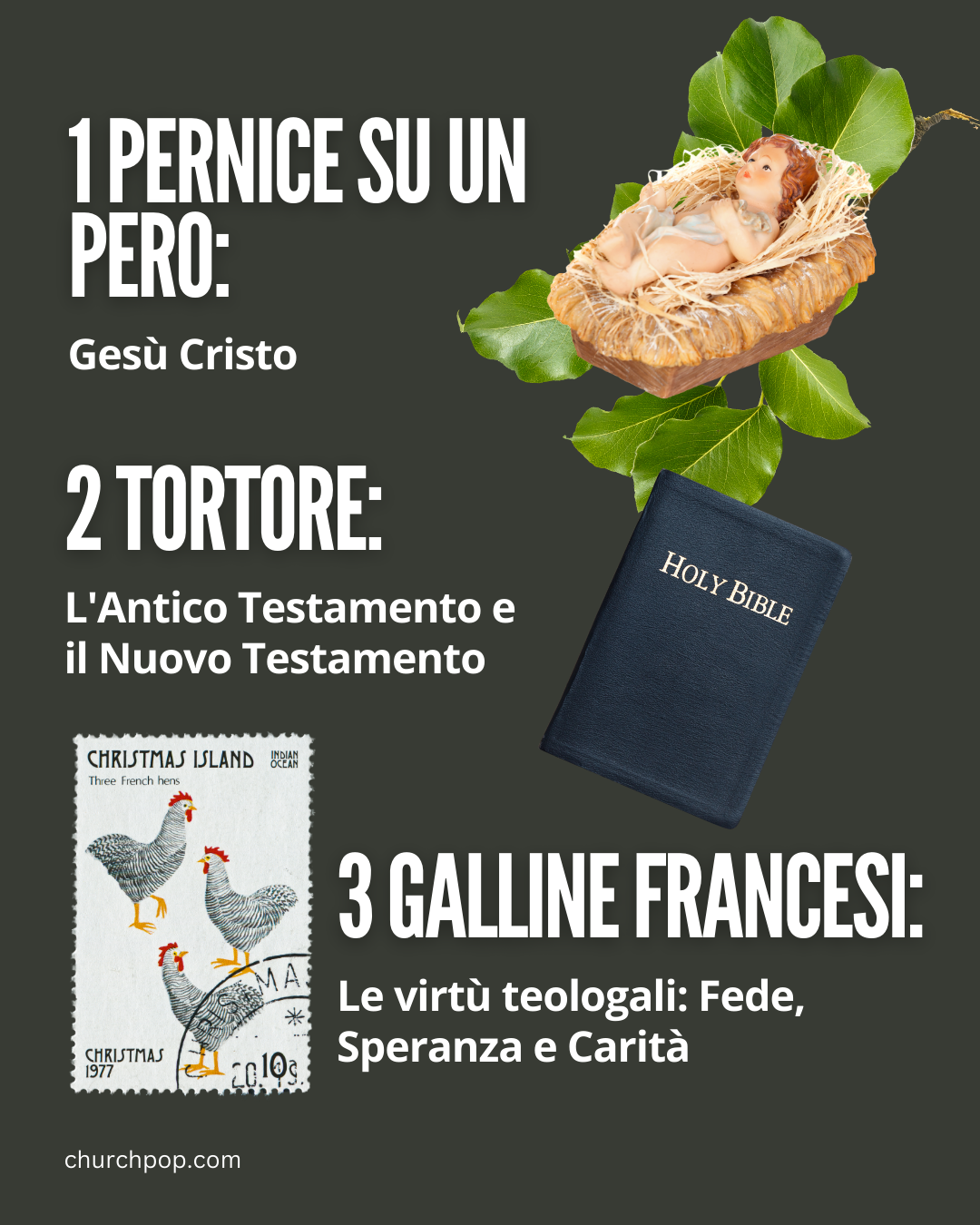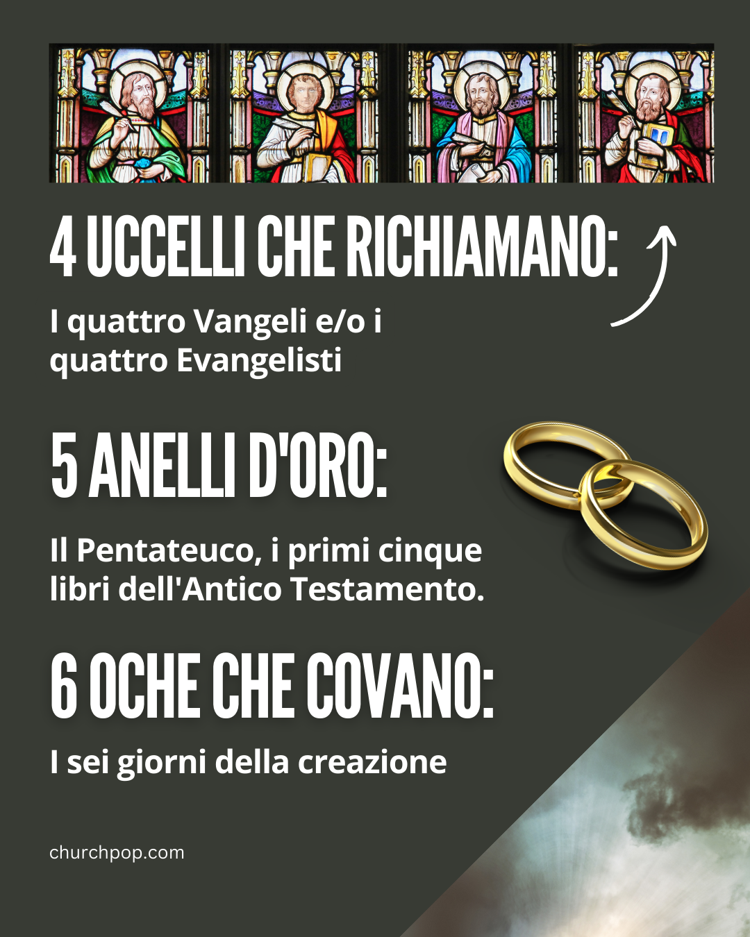 - Non è chiaro come la canzone possa aiutare nella catechesi. Non è chiaro come la maggior parte dei doni sia simbolicamente collegata alle presunte dottrine. Per esempio, le "tre galline francesi" aiutano a ricordare solo le virtù teologali, o qualsiasi altra dottrina che coinvolga il numero tre?