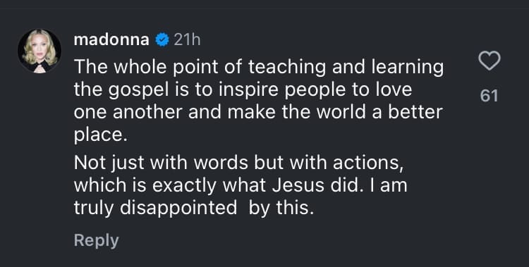 La cantante Madonna ha espresso la sua disapprovazione per un messaggio di Papa Leone XIV commentando un recente post della Catholic News Agency.