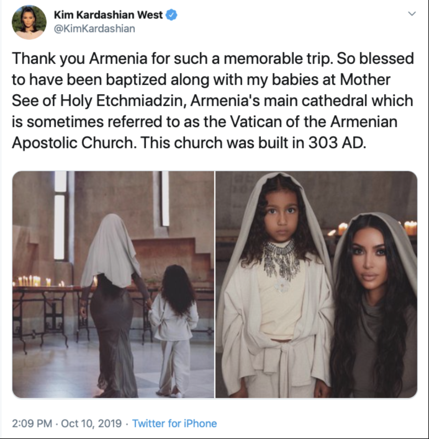 La nota personalità televisiva e imprenditrice e moglie di Kanye West ha dichiarato in un tweet del 10 ottobre scorso di “sentirsi fortunata ad essere stata battezzata insieme ai miei bambini presso la Madre Sede della Santa Etchmiadzin”, considerata il Vaticano della Chiesa Apostolica Armena.