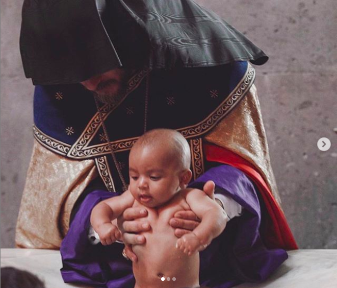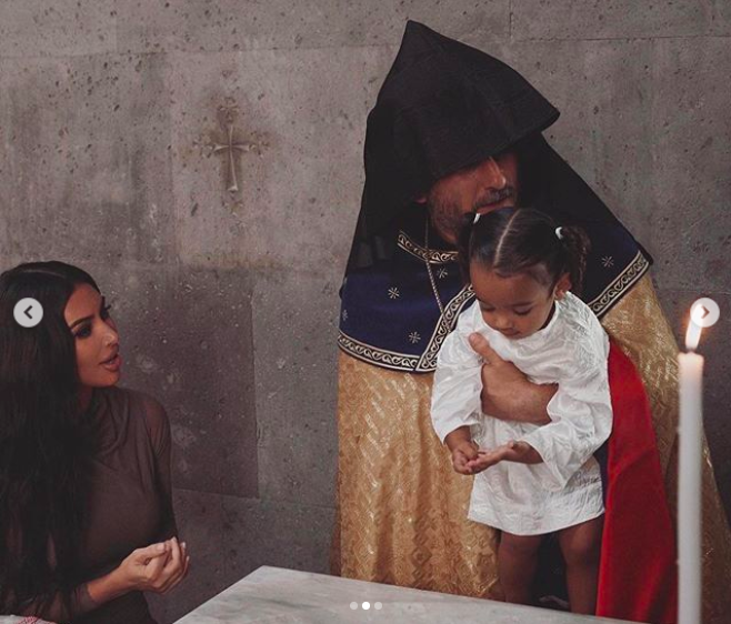 Kim Kardashian ha condiviso sui suoi account social le foto che la ritraggono mentre assiste al Battesimo dei suoi tre figli in Armenia.