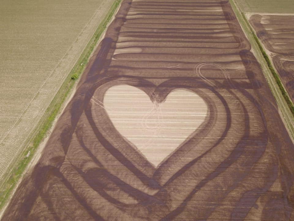 L’enorme scritta «Ave Maria» e il cuore sono opere di Federico, allevatore di Manerbio che nei giorni scorsi ha deciso di decorare i terreni della cooperativa agricola lombarda in cui lavora. Il materiale a disposizione? Un trattore e i reflui zootecnici.