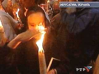 Quando il patriarca entra nel Santo Sepolcro, tutti i presenti cantano Kyrie Eleison (Signore, pietà) fino a che, inspiegabilmente, un fuoco appare dal nulla e accende 33 candele che il patriarca aveva precedentemente legato mentre stava da solo nel Santo Sepolcro. Finalmente, il patriarca prende le candele e le condivide con i fedeli che attendono ansiosi quel momento.