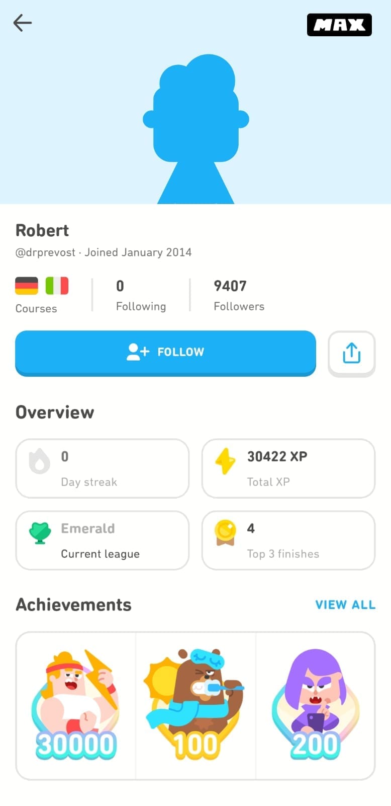 Il presunto account del Santo Padre ultimamente ha mostrato un notevole incremento dell'attività, dato che ha accumulato più di 30 mila XP in pochissimo tempo. Come si può vedere dall'app, @DrPrevost in passato ha studiato tedesco, ma recentemente ha aggiunto l'italiano, lingua che il Papa usa nel suo lavoro quotidiano.