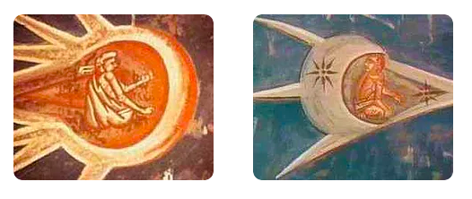 Nel primo caso, l’oggetto volante rappresenta il sole (a sinistra) e la luna (a destra). L’idea che al loro interno ci sia un essere che li pilota viene da una mitologia antica ed è lì solo per scopi stilistici.