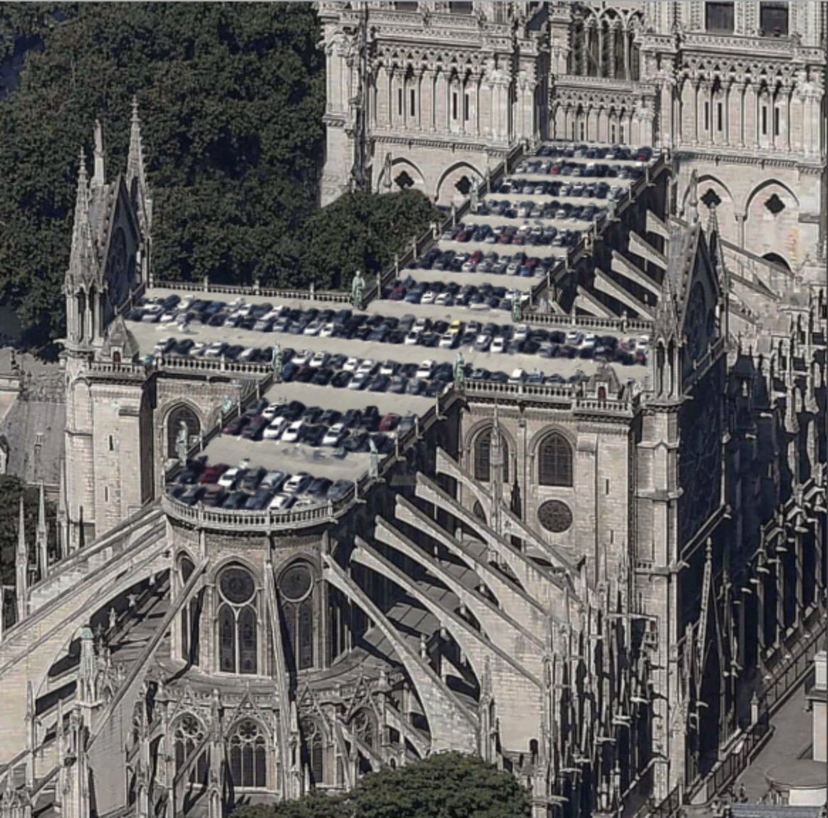 Su Twitter, Yung Yonge ha pubblicato un’immagine del tetto di Notre Dame ricoperto da un parcheggio a cielo aperto. Ovviamente si trattava di uno scherzo. Rob Cross invece, noto architetto, ha ribadito che sarebbe stato più comodo fare un parcheggio multipiano!