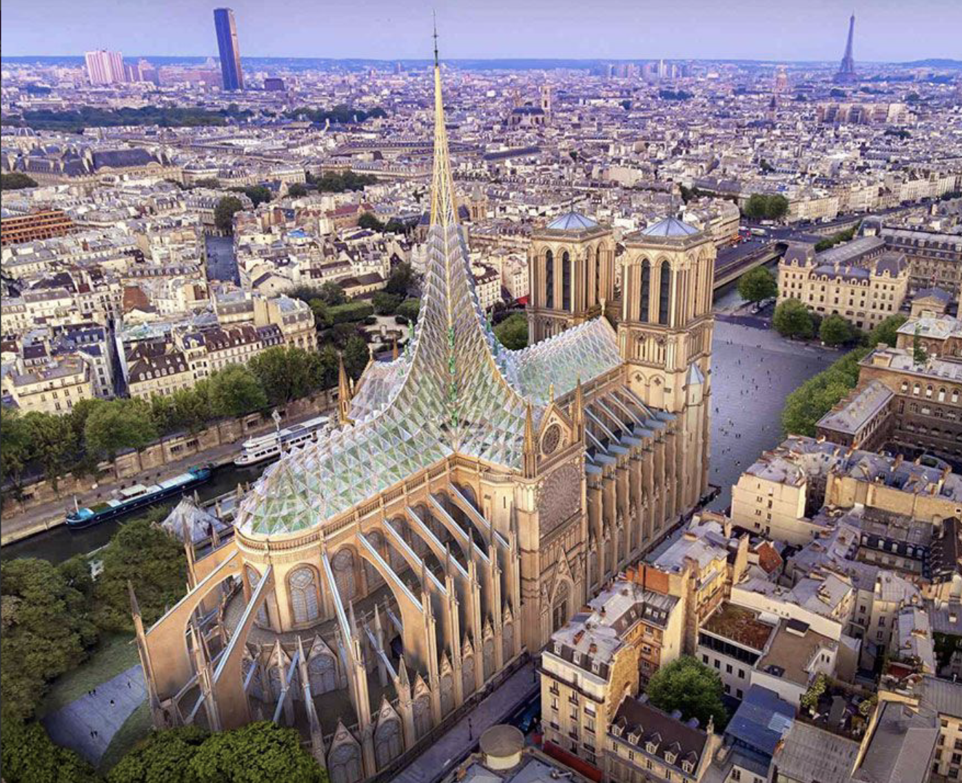 Chi non vorrebbe vivere sopra la Cattedrale di Notre Dame? Ecco la proposta abitativa dello studio di architettura Who Cares Design. Il grattacielo a vetro comprende anche un giardino e una piscina.