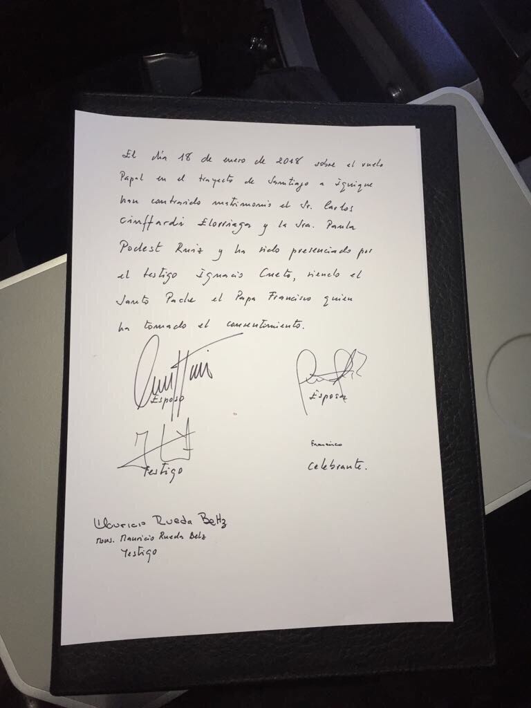 I fortunati e novelli sposi erano Paula Podest e Carlos Ciuffardi, entrambi in servizio nell’airbus 321, si sono rivolti al Santo Padre per chiedere la sua benedizione spiegandogli che erano sposati soltanto civilmente.